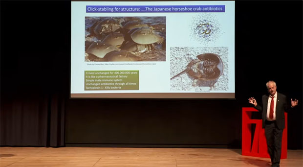 Sunumun bilimsel odağını click chemistry ve peptit temelli kimya çalışmaları oluşturdu. Prof. Dr. Meldal, click chemistry’nin başlangıçta farklı bir amaçla yürütülen bir deney sırasında beklenmedik bir ürünün fark edilmesiyle ortaya çıktığını, seçiciliği, yüksek verimi ve biyolojik sistemlerle uyumu sayesinde modern kimyada güçlü bir araç haline geldiğini anlattı. Bu yaklaşımın antibakteriyel peptitlerden protein tanıma sistemlerine, hücre içine madde taşıyan moleküllerden karmaşık protein yapılarının yeniden birleştirilmesine kadar çok farklı alanlarda kullanıldığını örneklerle aktardı.