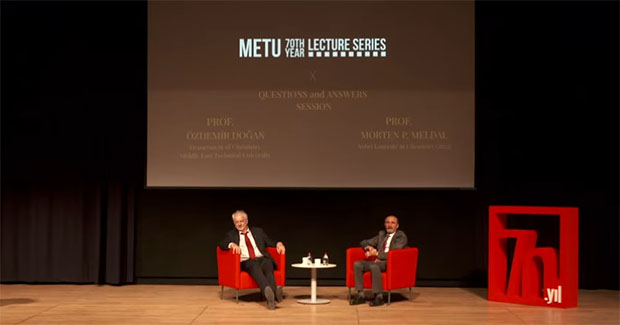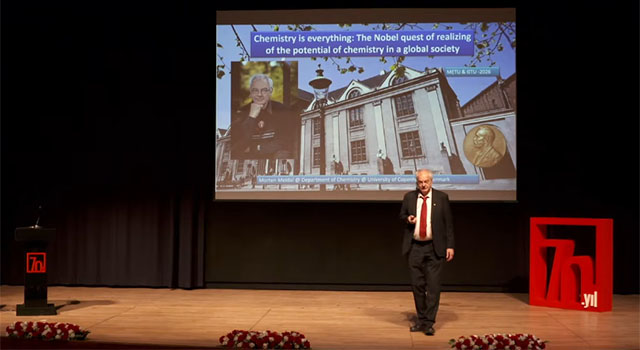 ODTÜ’nün 70. yıl kutlamaları kapsamında başlatılan “Distinguished Lecture Series” çerçevesinde, alanında öncü ve uluslararası düzeyde saygın bilim insanları ODTÜ’de ağırlanmaya devam ediyor. Bu kapsamda, Kimyagerler Derneği’nin katkılarıyla 9 Nisan 2026 tarihinde düzenlenen etkinlikte, 2022 Nobel Kimya Ödülü sahibi Prof. Dr. Morten Meldal, ODTÜ Kültür ve Kongre Merkezi Kemal Kurdaş Salonu’nda “Click Chemistry” (Klik Kimyası) başlıklı bir konuşma yaptı.